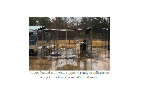 Dogs at the Humane Society’s shelter east of Jefferson were seen Friday with up to an inch of rain water in pens with excrement and wet blankets on the floors. In several cases tarps over the tops of pens were filled with water and appeared about ready to collapse on dogs underneath.