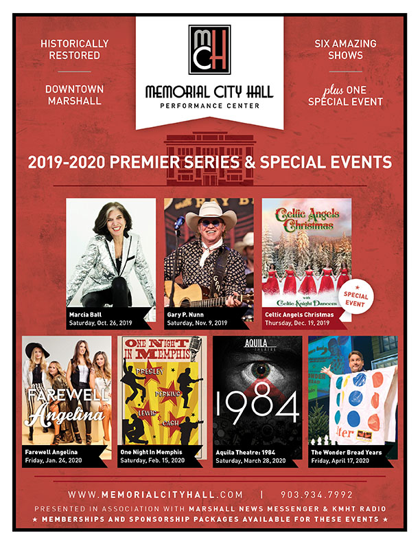 The inaugural performing arts season is presented in association with the Marshall News Messenger and KMHT Radio. Single ticket sales for all shows will begin on Monday, Sept. 23.