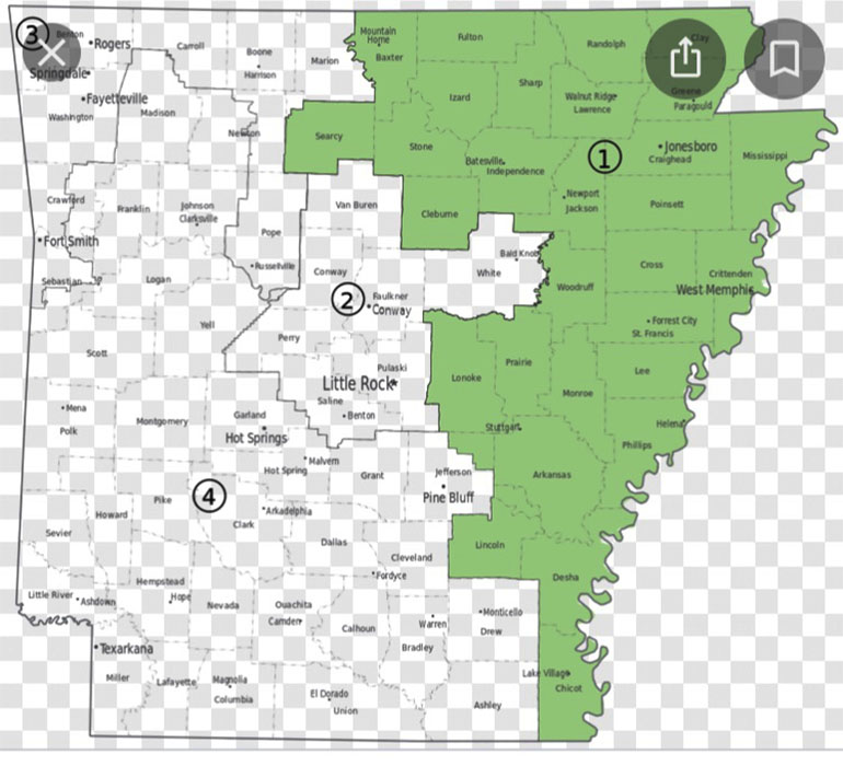Below: 1976 gerrymandering of Arkansas 1st Congressional District held by Democrat Bill Alexander contained 80 percent of the state’s minority population.