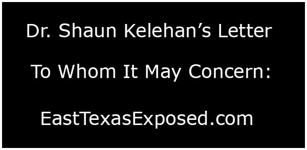 My name is Shaun B Kelehan, MD. I have been licensed in Texas for 20 years and have practiced in Marshall for the last 17+ years. I am writing this statement only to protect my staff and my family from any more heartache brought on by the allegations of sexual misconduct reported by a 45 year old male patient (My Patient–MP).
